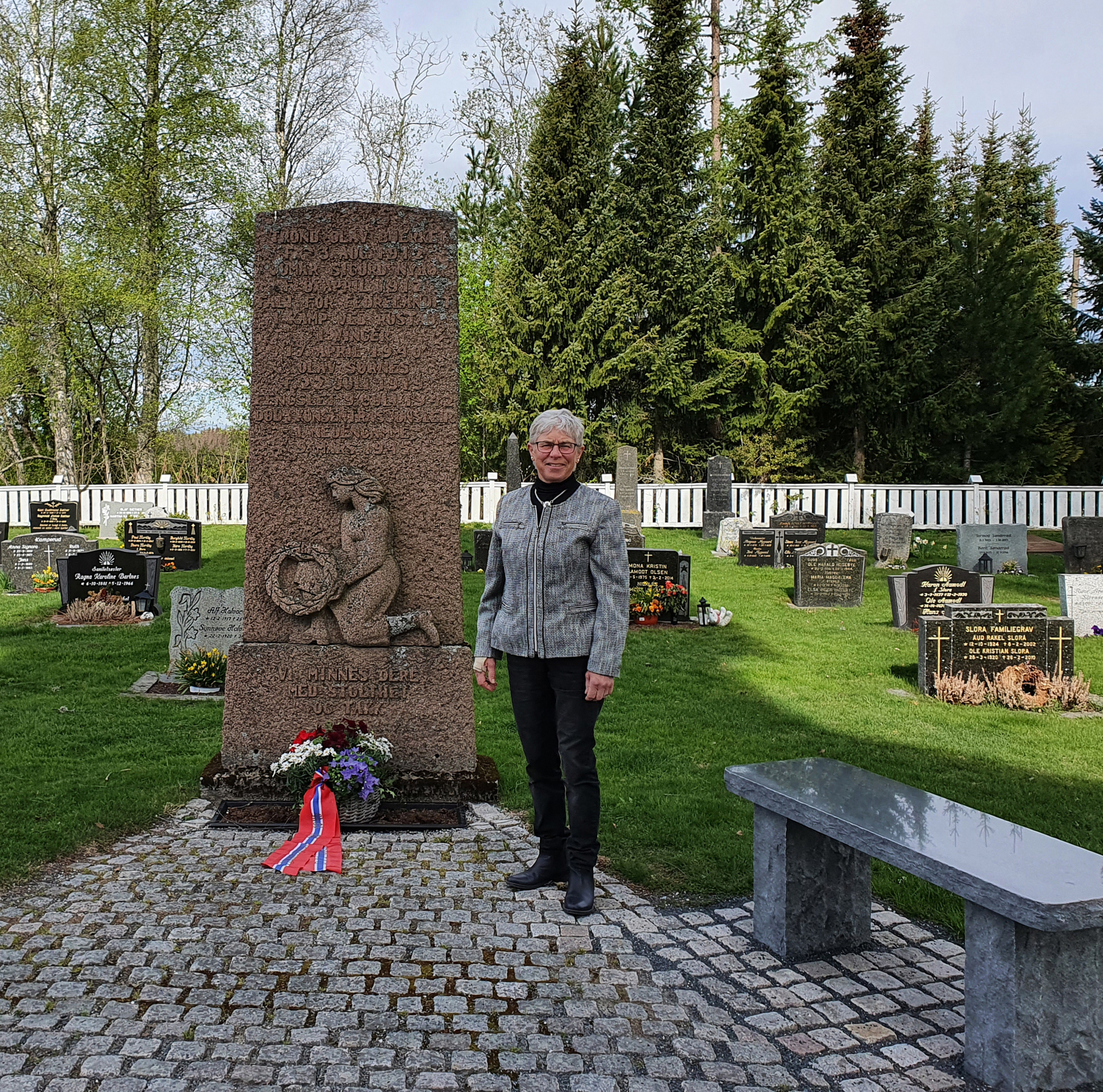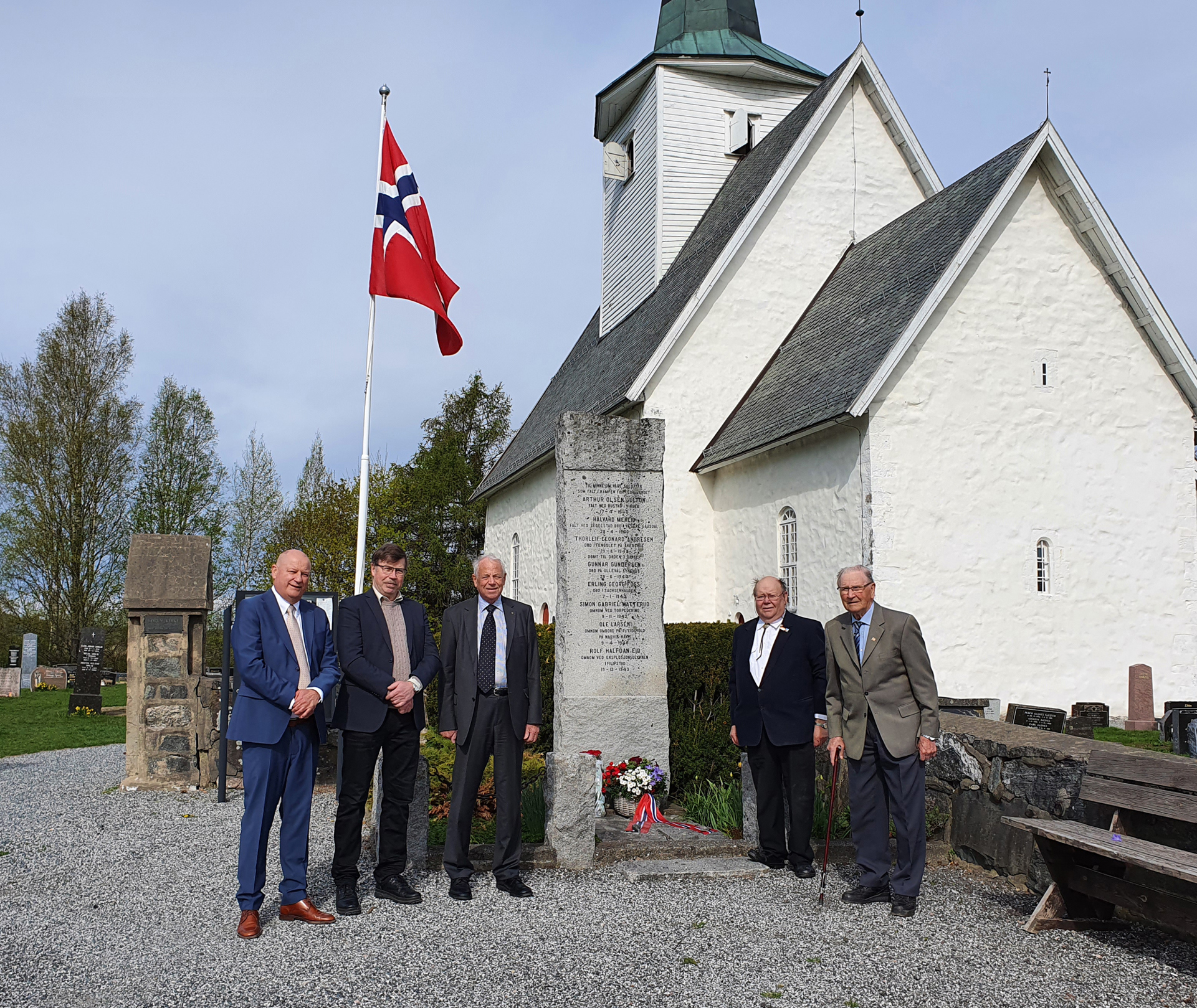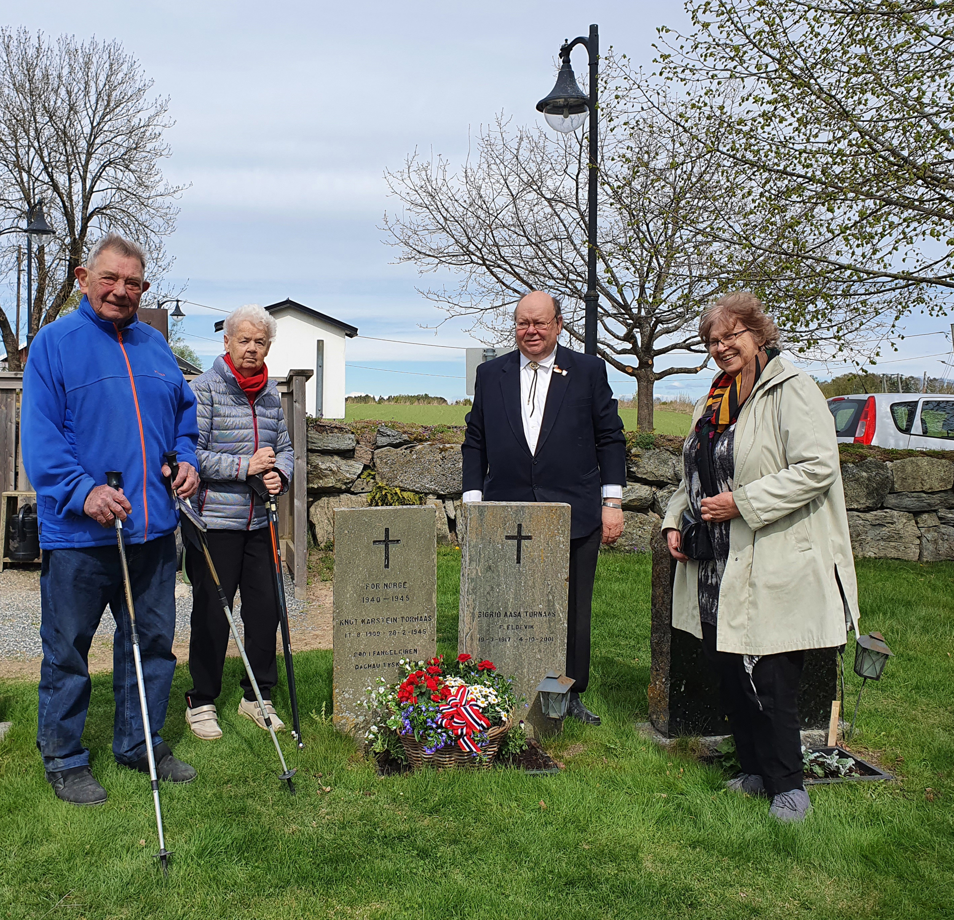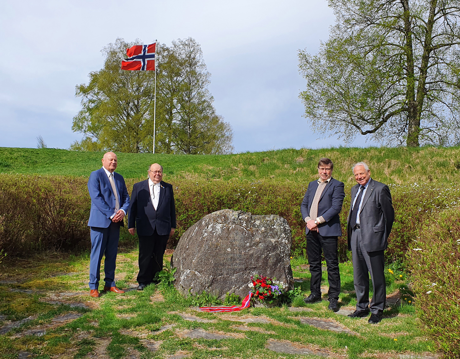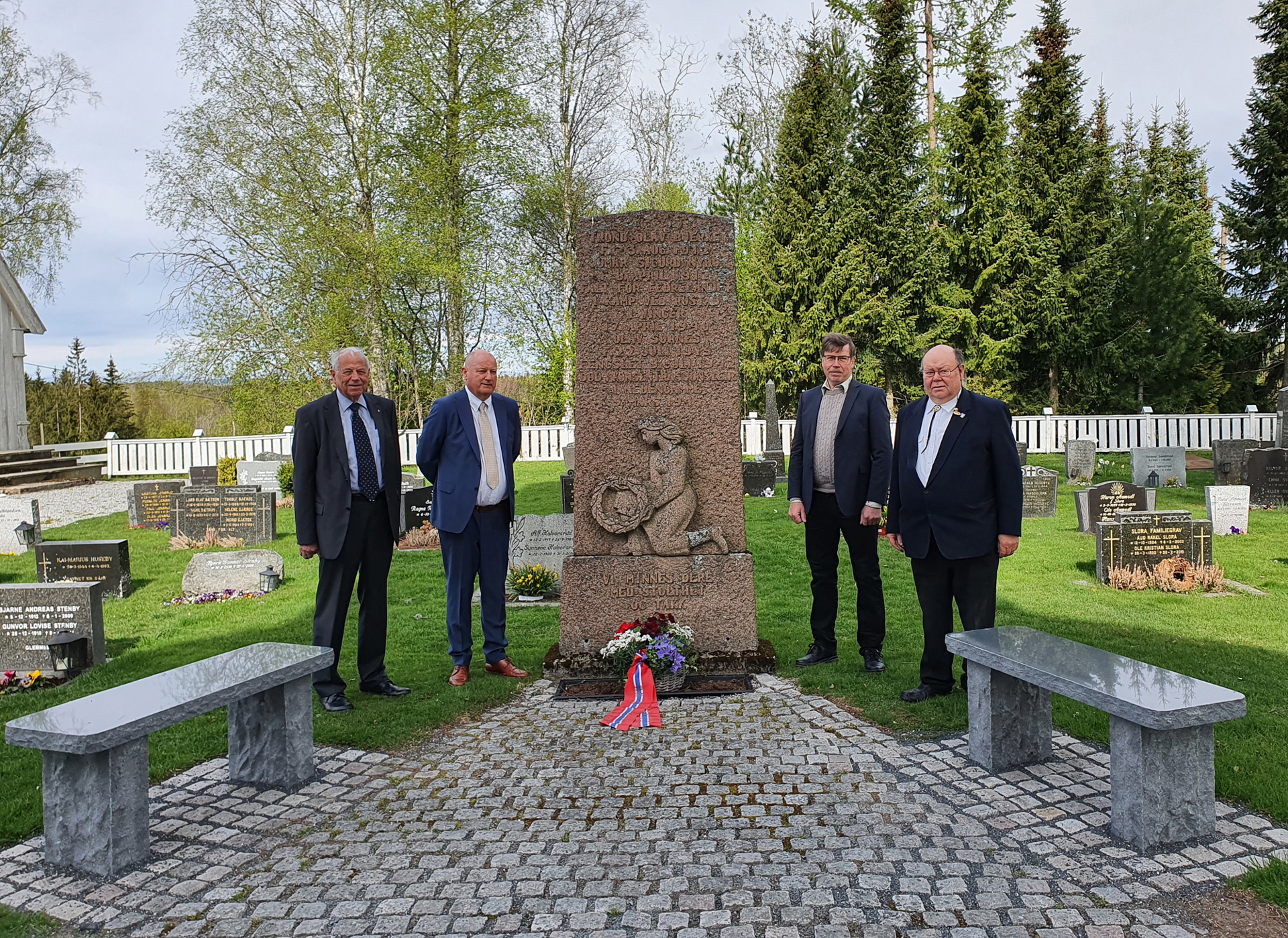 Tradisjonen tro hadde Blaker og Sørum Historielag blomsternedleggelse ved alle fire minnesmerkene i Sørum 8. mai 2020, en verdig 75-årsmarkering - også i koronaens tid. Det er fortsatt viktig å markere denne betydningsfulle dagen for fred og frihet i Norge. Disse blomstermarkeringene i nasjonalfarger er mulig takket være Borger Hansens fond, som siden 2011 forvaltes av Blaker og Sørum Historielag. Kåre Petter Hansen, donators sønn, representerer donator sammen med 8. mai-komitéens medlemmer Haakon Sandbraaten, Dag-Einar Hellerud og Kåre A. Bøhler. Borger Hansen (1922-2010) tjenestegjorde som ordonans i Milorgs Sørum-avdeling, så på blomsterbåndene er det skrevet «D12 Område 1215 - Hjemmestyrkene 1940-45». Foto: Lillian Mobæk