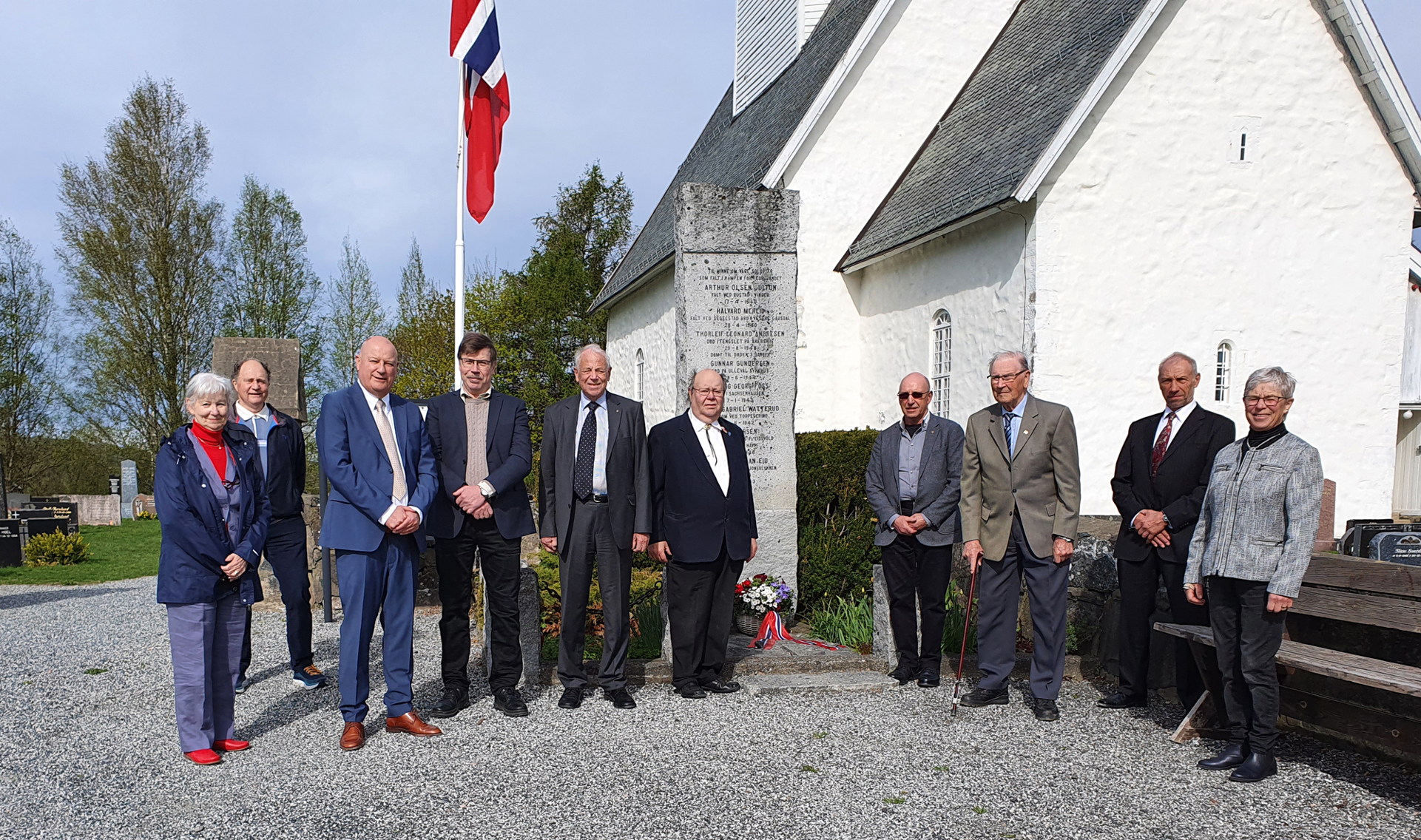 Tradisjonen tro hadde Blaker og Sørum Historielag blomsternedleggelse ved alle fire minnesmerkene i Sørum 8. mai 2020, en verdig 75-årsmarkering - også i koronaens tid. Det er fortsatt viktig å markere denne betydningsfulle dagen for fred og frihet i Norge. Disse blomstermarkeringene i nasjonalfarger er mulig takket være Borger Hansens fond, som siden 2011 forvaltes av Blaker og Sørum Historielag. Kåre Petter Hansen, donators sønn, representerer donator sammen med 8. mai-komitéens medlemmer Haakon Sandbraaten, Dag-Einar Hellerud og Kåre A. Bøhler. Borger Hansen (1922-2010) tjenestegjorde som ordonans i Milorgs Sørum-avdeling, så på blomsterbåndene er det skrevet «D12 Område 1215 - Hjemmestyrkene 1940-45». Foto: Lillian Mobæk