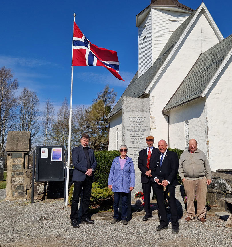 SØRUM KIRKE: Blomstermarkeringene starter alltid ved Sørum kirke kl. 10. Halvard Evensen Merlid la ned blomster der, og hedret sin onkels minne. Dette minnesmerket ble tillatt reist i 1941, med bare de to første navnene inngravert: Arthur Olsen Julton (1903-40), og Halvard Merlid (1916-40).