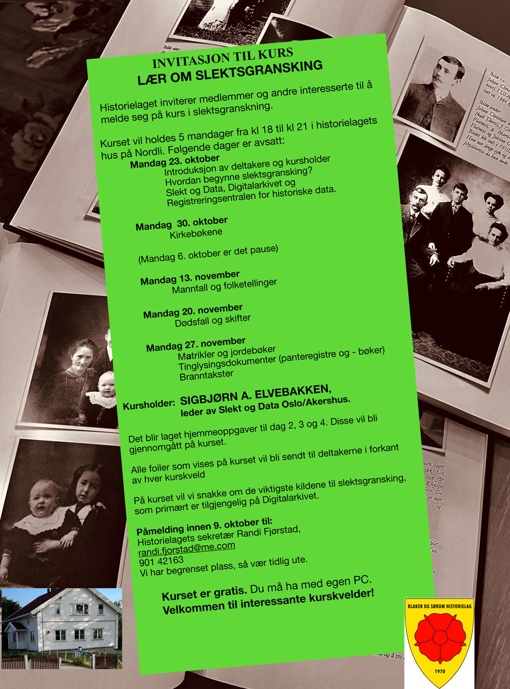 LÆR OM SLEKTSGRANSKING. Historielaget inviterer medlemmer og andre interesserte til å melde seg på kurs i slektsgransking. Kurset vil holdes 5 mandager fra kl. 18 til kl. 21 i historielagets hus på Nordli.