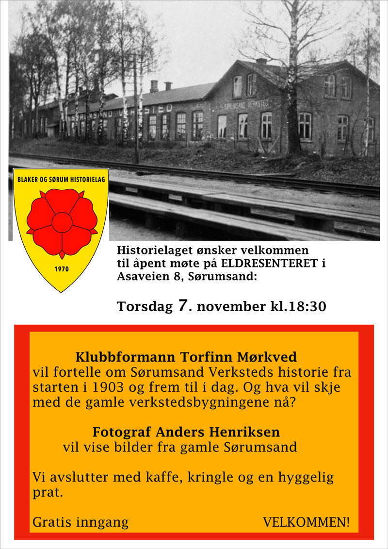 Klubbformann Torfinn Mørkved vil fortelle om Sørumsand Verksteds historie fra starten i 1903 og frem til i dag.