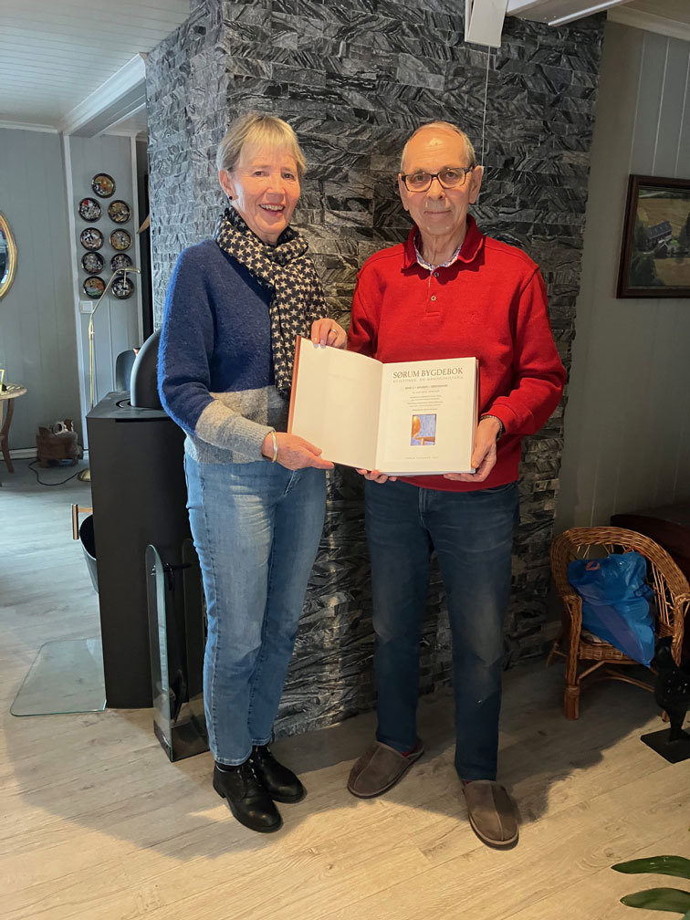 Bilde: Hege Udnæs Hoel og Per Stykket i Historielagets styre viser Sørum Bygdebok - bind 3, med 688 innholdsrike sider.