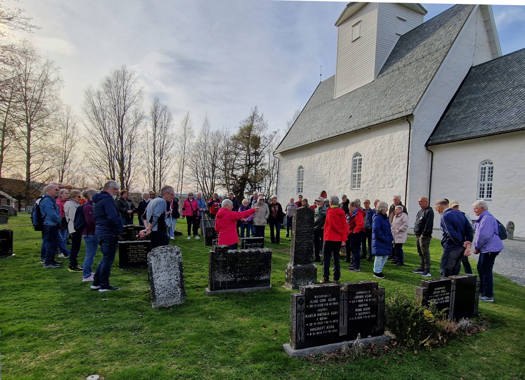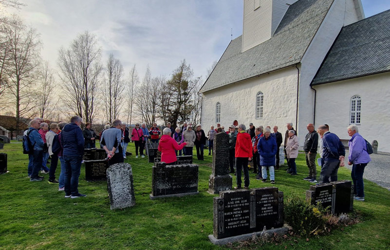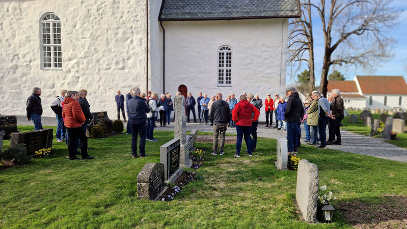 Elin Mørk fra turkomiteen ønsket velkommen, før Harald Stokstad startet omvisningen på den gamle kirkegården og fortalte om mange av de gamle gravminnene, minnesmerket fra krigen, gamle trær, og videre ut på den nyere kirkegården, litt om kapellet, og vandring til minnelundene.
