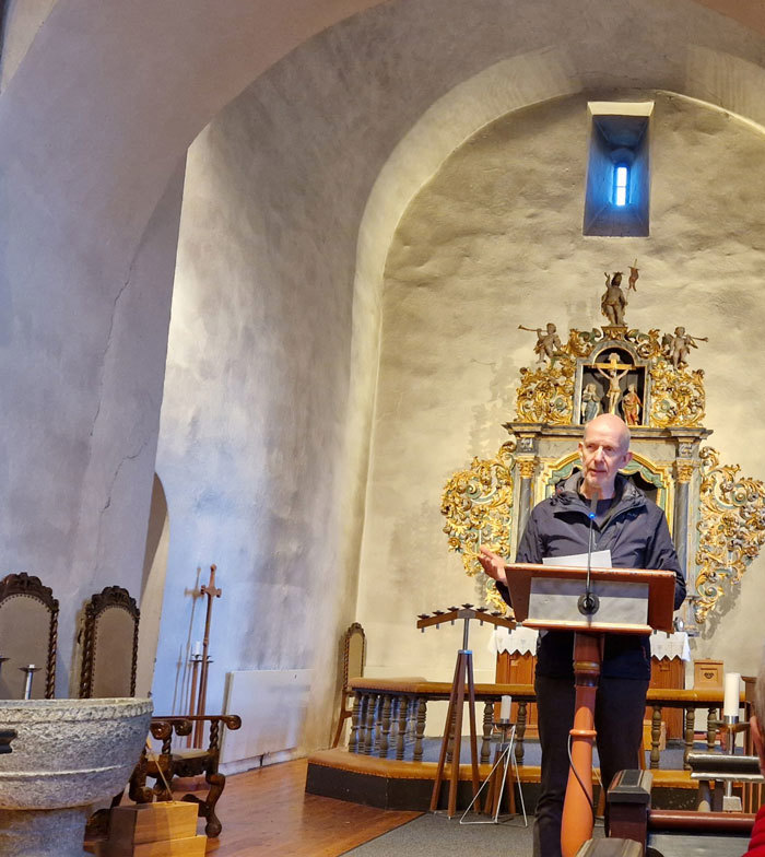 Harald Ringstad fortalte om det store restaureringsarbeidet på kirken i 2021, og hvordan bevaringsarbeidet for de gamle kirkene i landet nå er organisert, med et ambisiøst program for landets middelalderkirker før 2030 (1000-årsjubileet for kristendommen i Norge). Inne i kirken ga han en god orientering om de utbedringer som er gjort - en omstendelig prosess som først må godkjennes av Riksantikvaren.