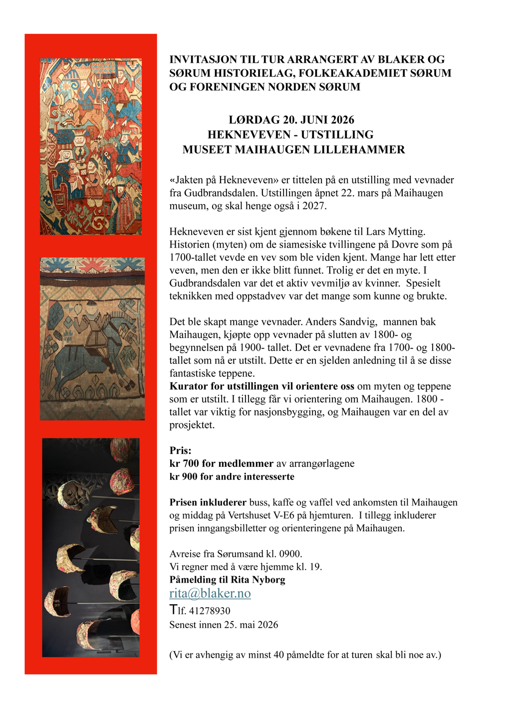 Påmelding til Rita Nyborg rita@blaker.no, tlf. 41278930. Senest innen 25. mai 2026.